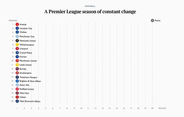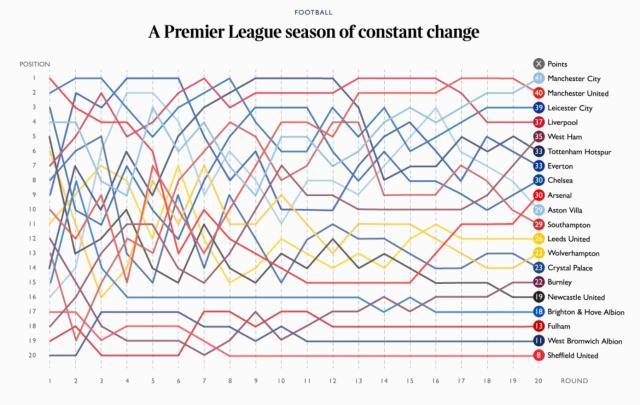 瞬间,曼联落后榜首曼城3分,芳邻还少打一轮。曼城补赛的对象是埃弗顿,以蓝月眼下的势头,敢赌他们不赢的人不多了。如果莱斯特城主场拿下利兹联,曼联还要丢失榜眼。赛前,《泰晤士报》点评半程:这是一个容错幅度较大的赛季,起伏都属暂时。该报用一张各队走势的动图做了注解(下图)。