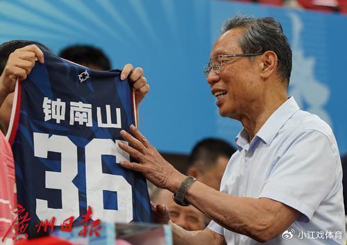 钟南山院士夫妇还获赠两件定制的球衣,数字36,代表钟南山伉俪出生于1936年。钟南山表示,通过体育认识了自己的老伴,而科技跟体育也要经常“七夕相会”。