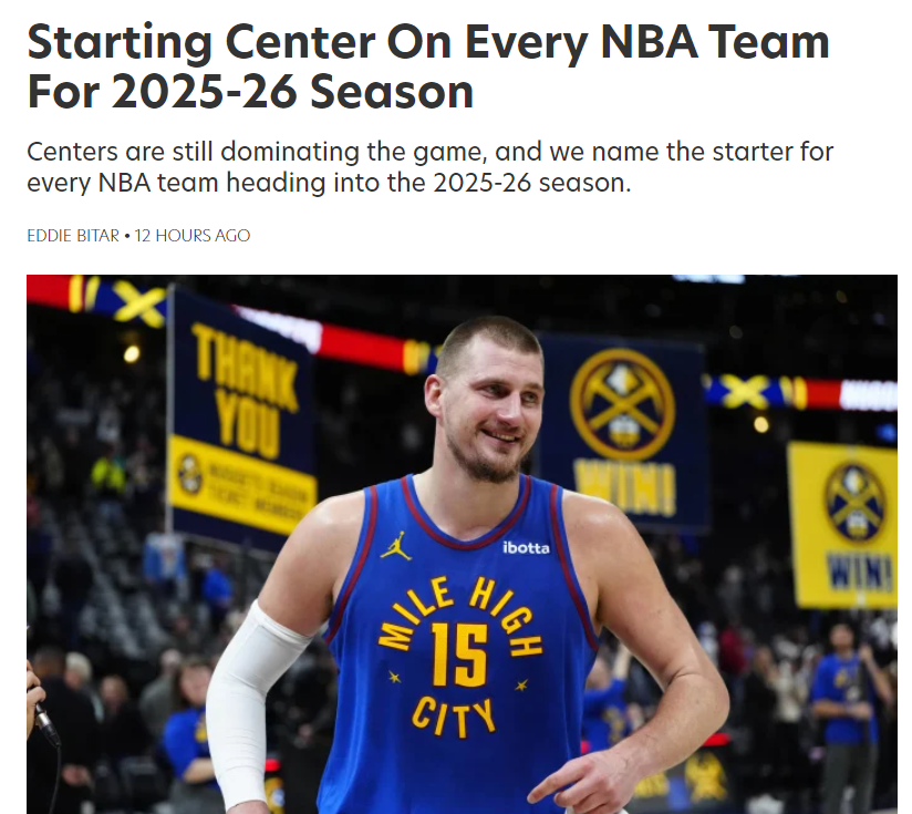 北京时间8月27日,美国媒体FW预测了25-26赛季联盟30支球队先发中锋的人选,海报是联盟第一人尼古拉-约基奇,他肯定是掘金的先发中锋这一点毫无悬念。