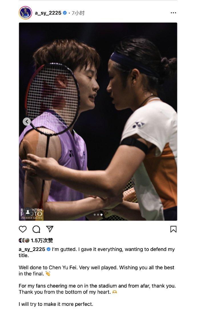 #安洗莹向陈雨菲致敬#安洗莹赛后发文:向陈雨菲致敬,打得实在精彩。祝你在决赛一切顺利。👏感谢在赛场内外为我加油的每一位球迷,谢谢你们,发自内心地谢谢你们。🫶